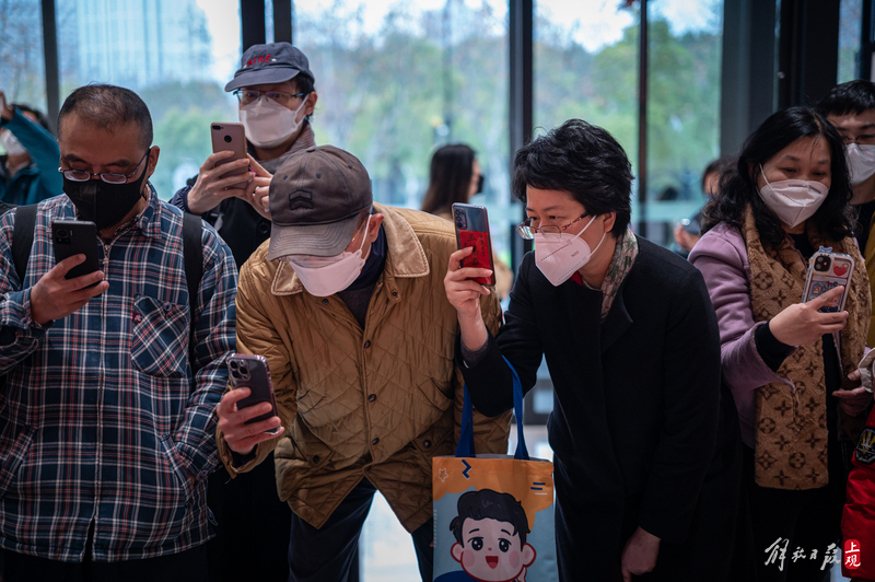 领到书法作品的市民们纷纷举起展示,在美术馆里拍照留念。