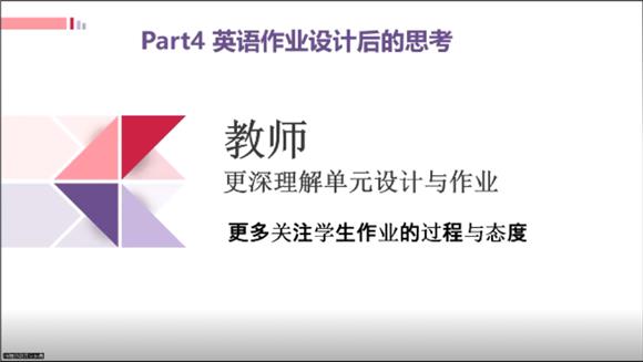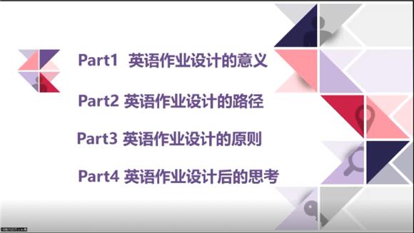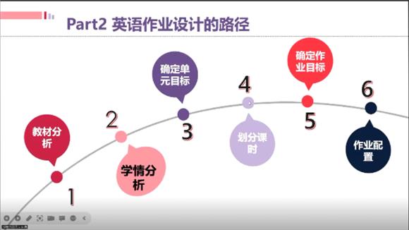 孙老师从教材分析、学情分析、确定单元目标、划分课时、确定作业目标和作业配置这几个方面明晰了作业设计的路径,并提示大家要遵循关注单元目标、课时目标、作业目标的链接,注重主题语境化,基于学生需求和以作业多样化促进学生学习方式改变等原则。