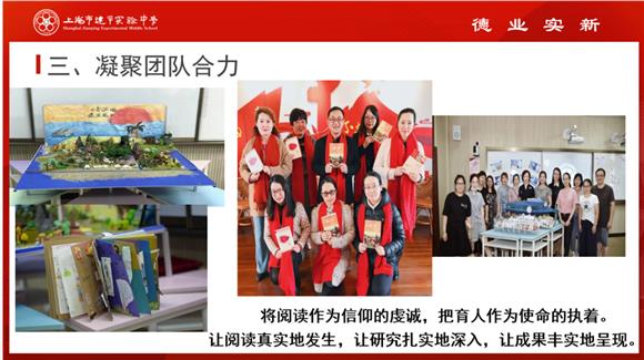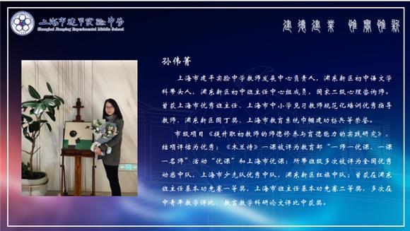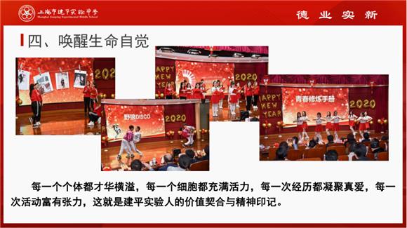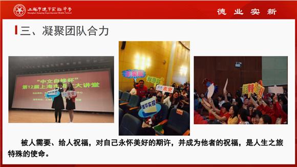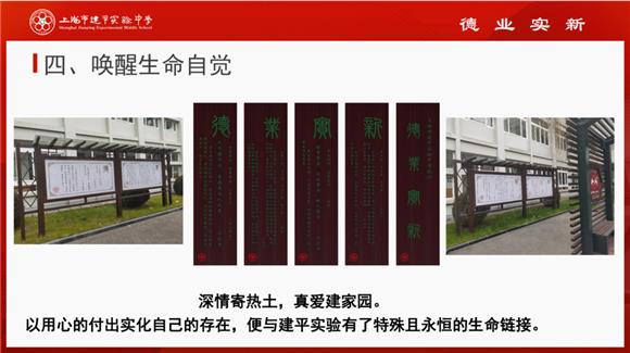 最后,孙老师从唤醒生命自觉的角度,鼓励青年教师探寻更宽广的境界,关注更宏大的命题,联结更深层级的生命体验,她以和新教师一起积极投入校园文化传承与创新的经历,让老师们领会到:深情寄热土,真爱建家园,我们以用心的付出实化了自身的存在,我们便与建平实验中学建立了特殊且永恒的生命链接。