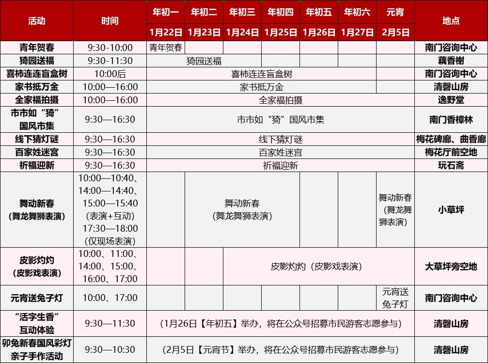 跨界合作、加入老字号元素,成为今年上海古猗园文化活动的另一个特点。春节元宵期间,古猗园将联动上海市历史博物馆和上海印刷字体展示馆举办特色展览,以吉祥文化和汉字演变展示传统文化魅力,营造温暖如家的园林古韵新春。市民游客可前往梅花厅参观“见字如面 活字生香”——字体寻根展,感受字体的历史演变、趣味变体等,还可以现场拓印体验老字号品牌的独有魅力。也可在鸳鸯厅内品位“人生旅途 吉祥一生”——家宅吉祥文化展,通过不同人生阶段吉祥纹饰的变迁,感受人们对幸福美满人生的热爱与追寻。展览将向市民免费开放,邀请广大市民阖家团圆逛园林、欢欢喜喜过大年。