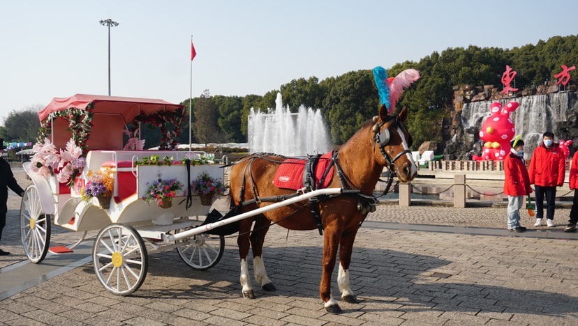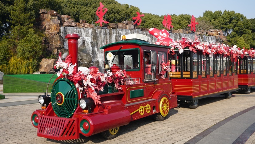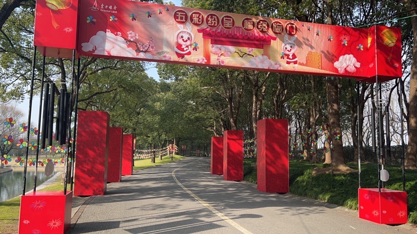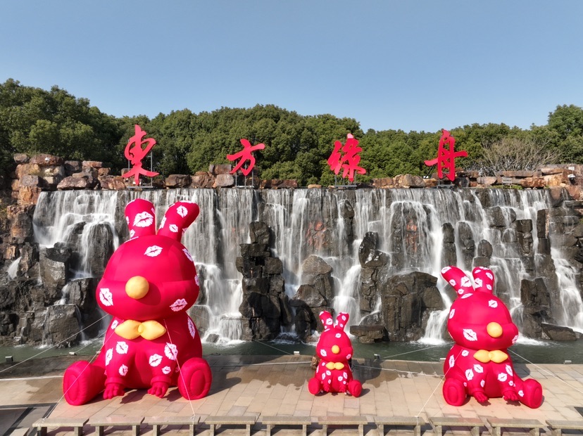 大门前,三只高8米的红色巨型“摩登兔”吸引了众多游客拍照纪念,也象征着红红火火的一年。景区内色彩斑斓的风车,串联起沿途旖旎风光。东方绿舟在营造浓厚春节氛围的同时,也让市民游客感受到了春节的仪式感。