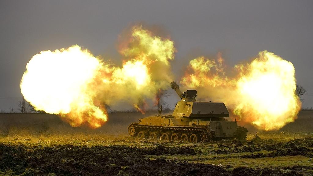 当地时间2023年1月22日,扎波罗热地区,俄罗斯的特别军事行动中,一门Akatsiya自行火炮正在发射。 视觉中国 图