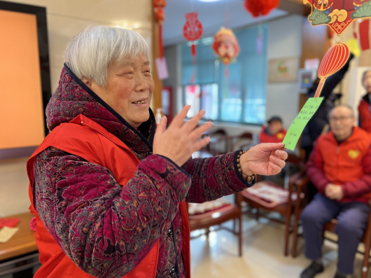 紧接着老人们迎来了“闹元宵”的压轴活动——猜灯谜!大家看着灯笼上的灯谜,纷纷认真思考起来。“我知道了!”83岁的王阿婆率先答出了灯谜,获得了一件小礼品,“虽然不贵重,但是很暖心!”