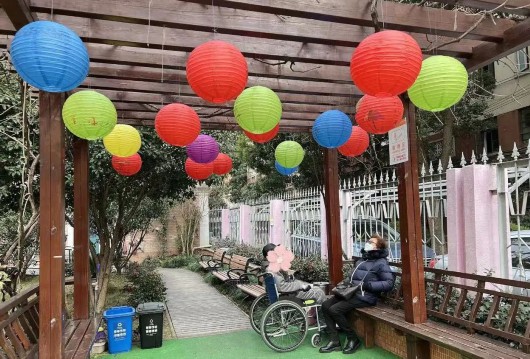 老人们拎着自己制作的灯笼,相互欣赏起来。随后,工作人员将灯笼全部挂在了花园的长廊里,五彩缤纷又趣味十足的花灯,增添了浓浓的节日气氛。