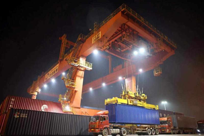 图为夜幕下的西安国际港站,对重点物资进行分拨转运。(受访者供图)