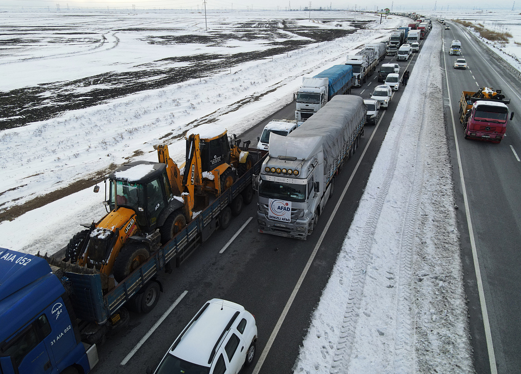 当地时间2023年2月7日,土耳其安卡拉,俯瞰公路上行驶的卡车,车上载有各种设备和救援物资。视觉中国 图