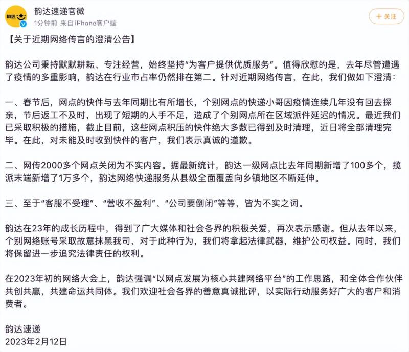 2月12日,韵达速递官微发布澄清公告,针对近期网络传言作如下澄清: