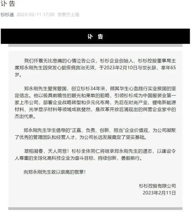 2月11日晚,杉杉控股有限公司对外发布讣告: