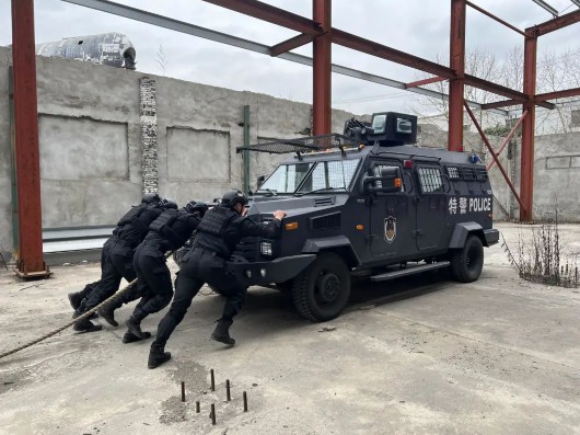 团队协作力量训练,是杨浦特警支队一项“明星”训练科目。一辆重达9吨的装甲车,在四名特警队员的强力拖拽下,缓缓向前移动。特警刘行告诉记者,拖拽装甲车训练科目,锻炼队员们的爆发力量,也考验四人团队协作的能力。在环境多变的紧急处突行动中,团队协作往往是制敌关键。