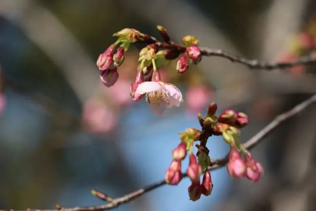 雨水刚过,初春的顾村公园,是属于婴儿粉般娇嫩的樱花。它们像极了这欲说还休的春,温温柔柔,芬芳缥缈。樱花林内的椿寒樱,上周还是一个个饱满的花苞,现在都慢慢地露出一点娇嫩的粉色花瓣,不久就会和大家见面啦。