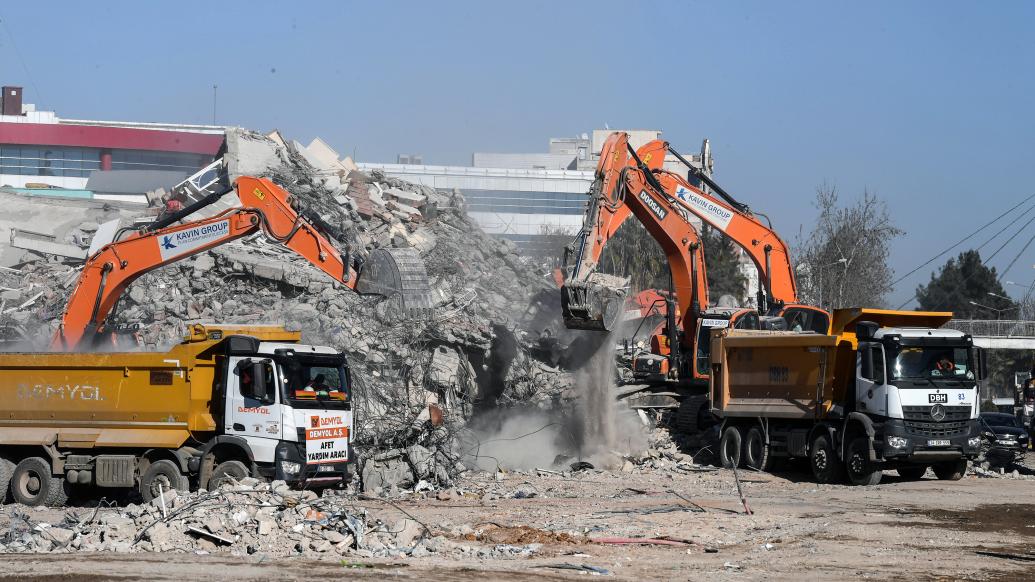 2月18日,在土耳其南部阿德亚曼省阿德亚曼市,挖掘机清理建筑物废墟。  新华社 发(穆斯塔法·卡亚 摄)
