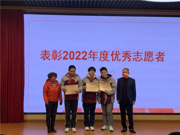 浦兴街道社区服务办主任龚细华老师宣读2022年度浦兴天使爱心学校优秀志愿者名单,龚主任和柳书记为获奖者颁奖。