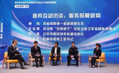 嘉宾互动访谈环节中,虹梅街道党工委书记范润生,区检察院第一检察部副主任顾伟,区法院“甘棠树下”社区法官工作室团队负责人王宏霞,公安分局经侦支队副支队长黎源,漕河泾开发区总公司副总经理方银儿,仪电集团副总裁、总法律顾问张丽虹,米哈游科技法务总监罗希,围绕“服务保障营商”、“共享共建法治”展开深入交流互动。微软亚太、核工院、泰科电子等重点企业的代表进行视频发言。