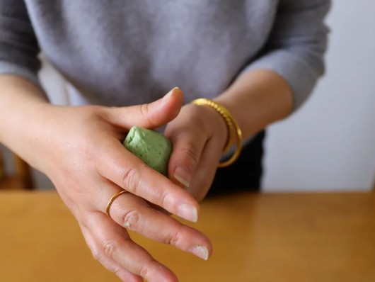 青团可包万物,有最传统的豆沙馅、芝麻馅,也有咸蛋黄馅、芋泥馅、粉丝馅、梅干菜馅。用双手将这些馅料包入揉好的面团中,再小心翼翼地搓圆。