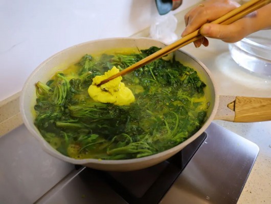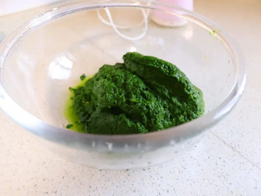 麻花郎采摘完毕后,去除黄色的枯叶,剪去根部,冲洗后焯水。在焯水过程中,至关重要的一步,就是需要加入生石灰料包,用来去除麻花郎的苦涩味。焯水后,仍要连续清洗几遍,最后放入搅拌机搅成菜泥,拌入面粉,揉成面团。