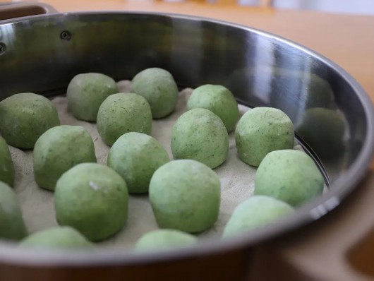 在水蒸气的作用下,一个个青团慢慢变成了色如碧玉的模样,带着清香的田间芬芳,一口下去甘甜细腻,糯韧绵软。