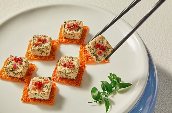 同样是享誉沪上的百年老字号上海德兴馆也拿香椿做起了新文章:香椿搭配老豆腐和火腿,不仅摆盘好看口味也很独树一帜。据上海德兴馆品牌总厨、复兴荟店厨师长梅林介绍,这道“金腿香椿拌豆腐”制作起来要比一般的凉菜更费功夫:首先香椿芽要焯水后切成细末,再与碾碎的老豆腐充分拌匀,随后压制成大小一致的方块状,置于炸好的金黄豆衣“底座”上,最后再洒上少许火腿丁增色。上桌后,这一盘黄、白、红三色相间的创意新品绝对让人食指大动。