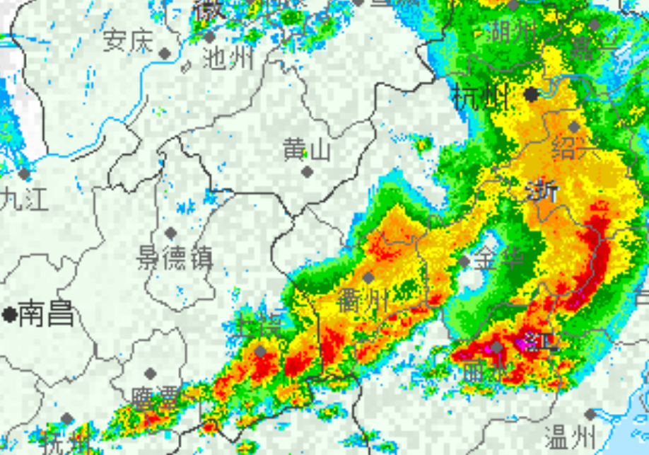 今天午后,浙江中部回波较强,丽水附近还有紫色回波出现。