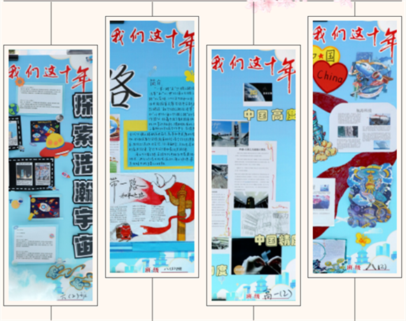 星光不负赶路人,最是奋斗动人心。十年的发展,十年的进步。各个班级的小能手们聚焦“十年里的中国”,他们用一串串的数字、一张张的图片设计成了一块块展板,记录着中国十年间在经济、科技、文化、城市建设等各个领域的腾飞。一展尽览中国大地十年巨变,精彩的“中国故事”带给教科学子们的是骄傲和自豪,更是振奋和鼓舞。
