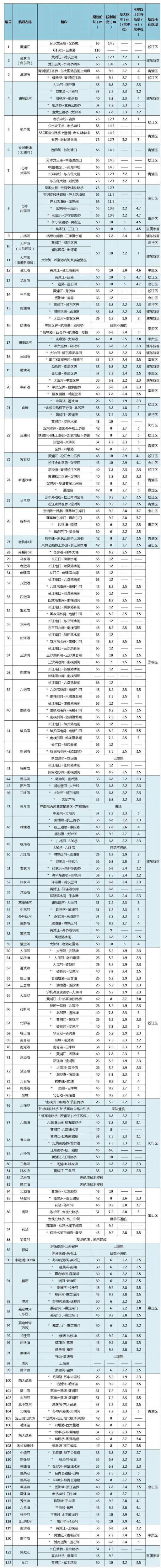 为进一步确保上海市内河航运和跨航道桥梁安全,规范船舶有序发展,降低通航安全隐患,市交通委发布了本市内河航道限制船舶主尺度表,详见下文↓