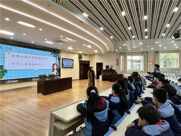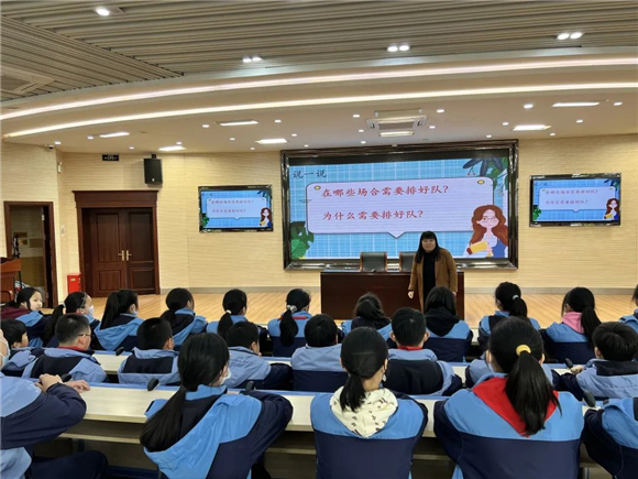 袁小艳老师展示了《说说排队这件事儿》微班会,引导同学们反思自己的排队行为,思考需要排队的场合,明白排队的重要性,思考排队需要注意的地方。袁老师鼓励把今天学到落实到今后的行动中,做文明的践行者。