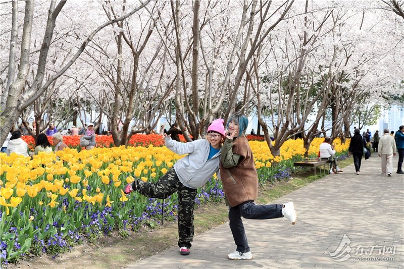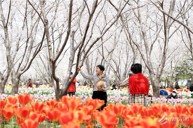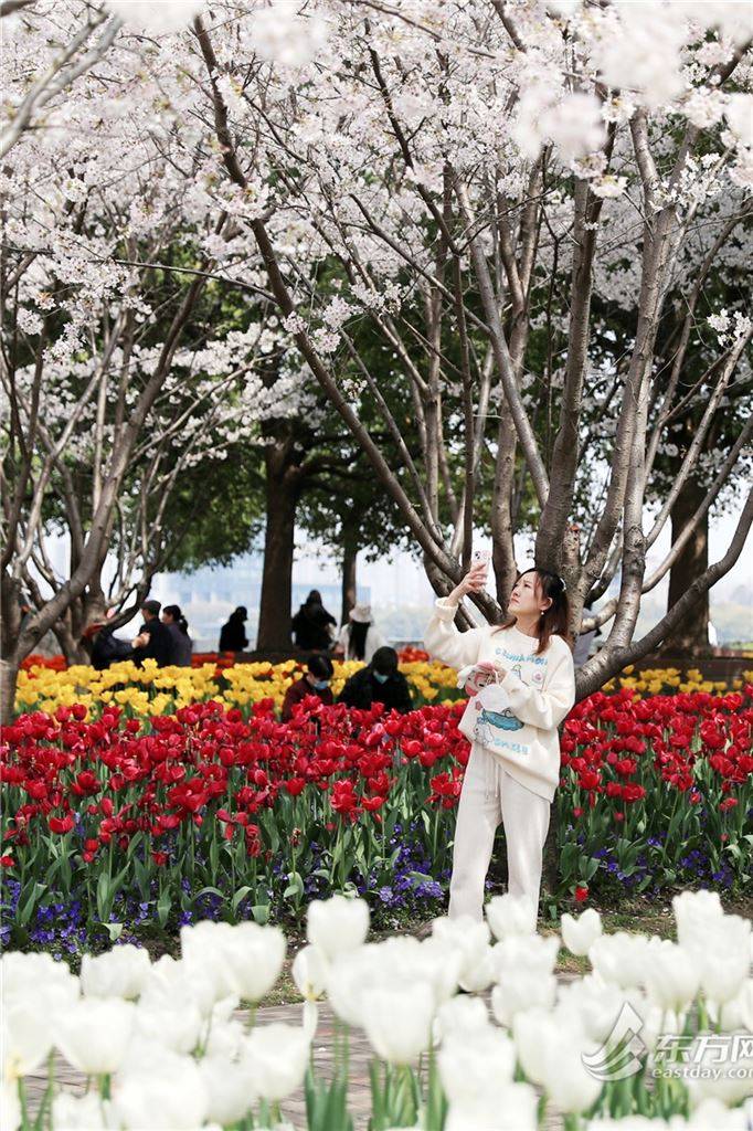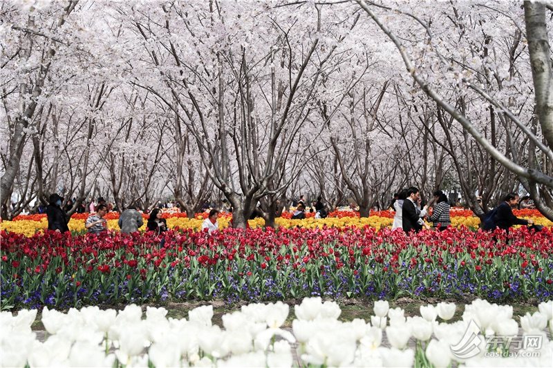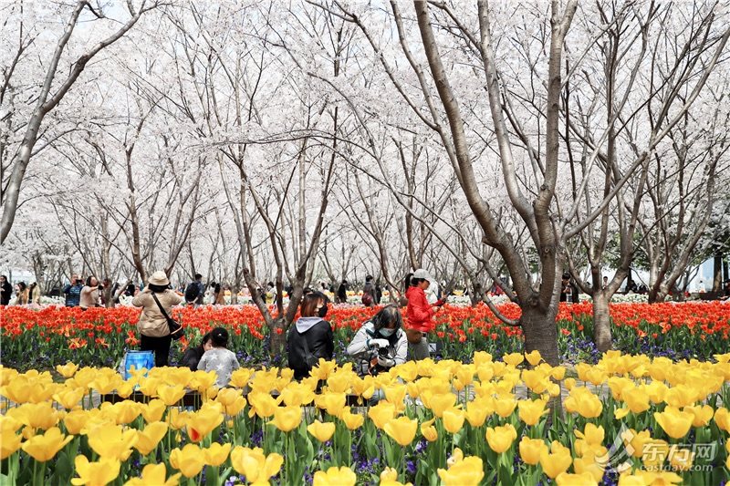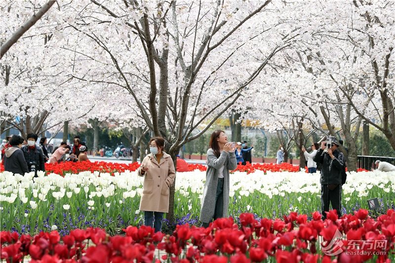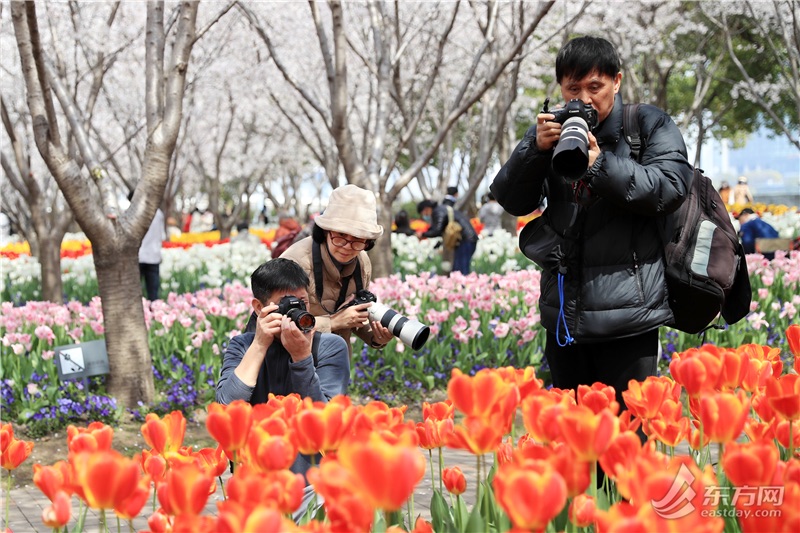 东方网记者柏可林3月27日摄影报道:阳春三月,黄浦滨江的琴键春园已到了最美时刻。万千朵郁金香与成排樱花互相呼应,郁金香温柔恬雅,樱花飘飞似雪,樱花加郁金香的组合让人目不暇接、流连忘返。