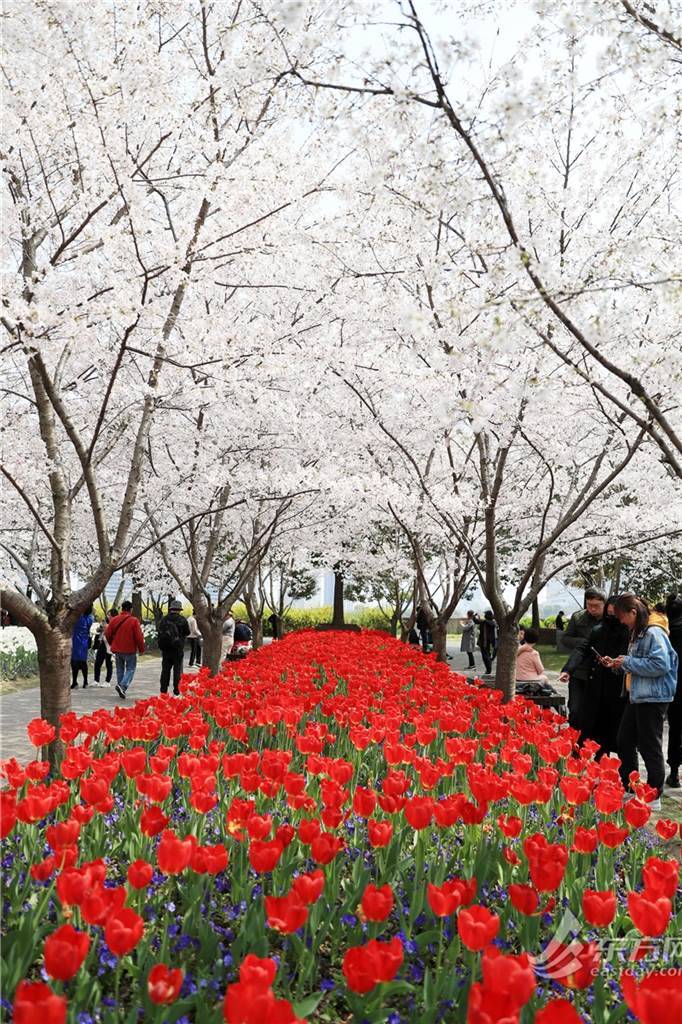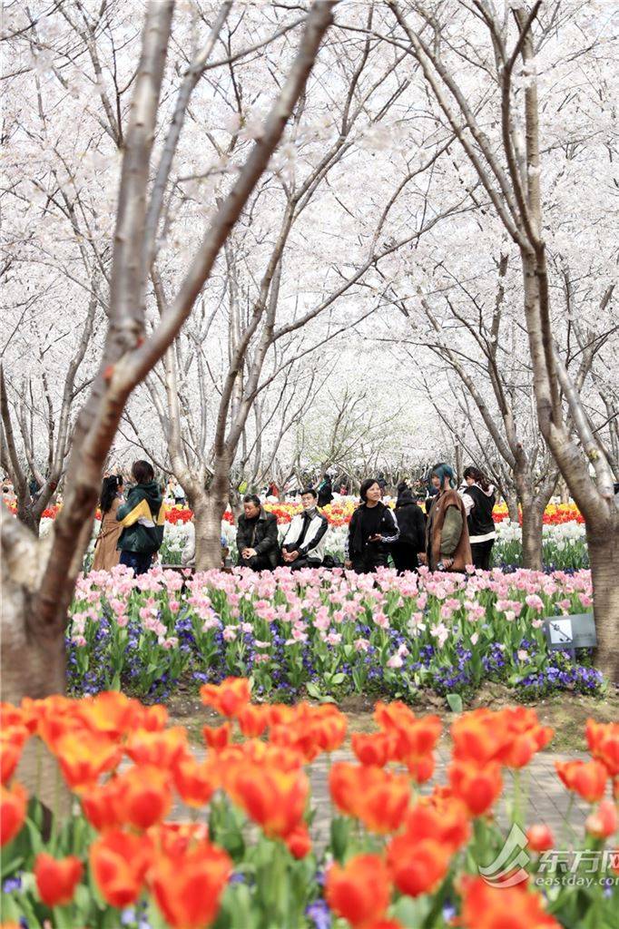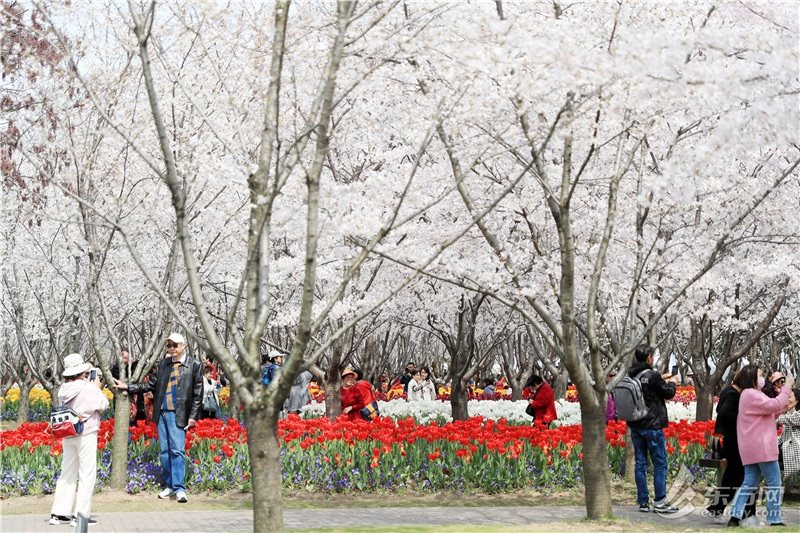 而从地面往上看,眼前,樱花成片,或是含苞初放、粉粉嫩嫩,或是尽情绽放、娇艳欲滴,站在樱花林中会感受到这个春天独有的香甜。地面上千姿百态的郁金香,则在樱花的剪影下,绽放出最热烈的色彩。