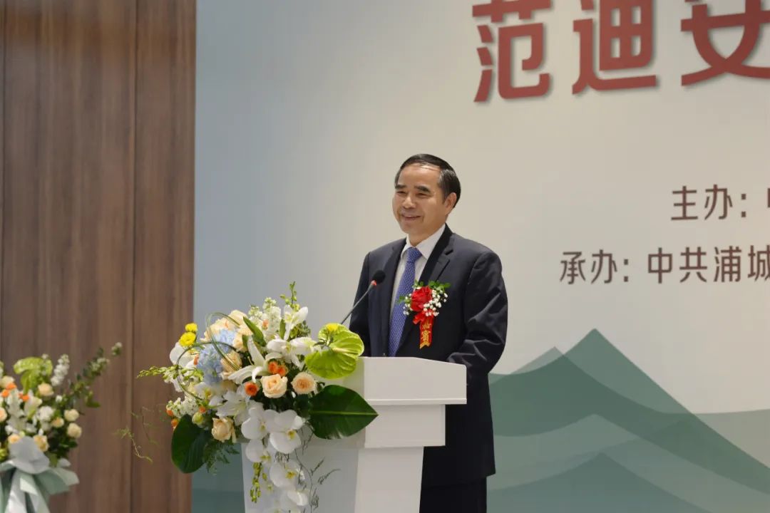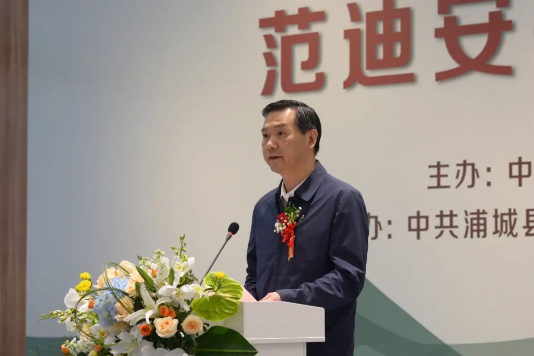 范迪安在致辞中表示家乡浦城是青山碧水、钟灵毓秀之地,自古以来人文历史积淀深厚,文化传统养育人才。近年来,县委、县政府高度重视精神文明建设和文化传承创新,以富有前瞻性的规划布局,为人民群众高品质生活需求提供文化供给。如今,在古代著名诗人江淹“梦笔生花”的地方建设浦城美术馆,不仅让美术馆拥有更加悠远而浓郁的人文气息,更是千古文心一脉相承的重要体现。为此,他将把一大批油画、水彩、书法作品捐赠给浦城县,由浦城美术馆永久收藏,同时,还将捐赠一批内容丰富的艺术图书,在美术馆内设立“美育图书馆”,回报家乡、服务人民,希望能在以文化人、以美育人中发挥应有作用。