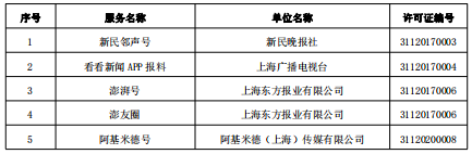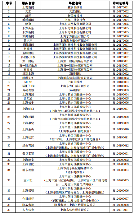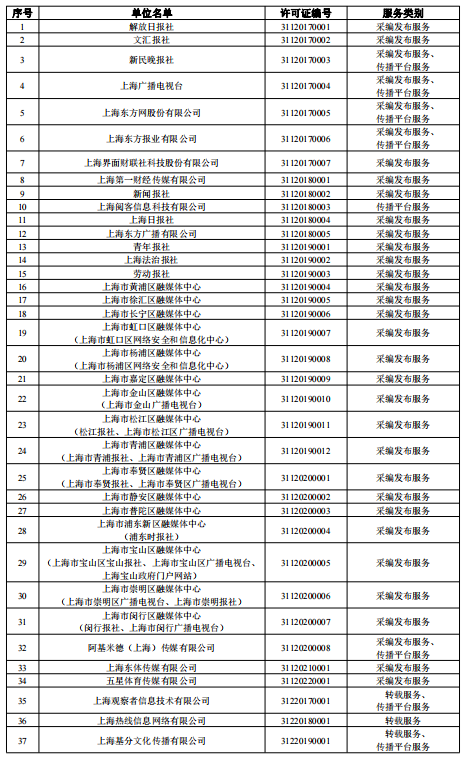 截至2023年3月31日,由上海市互联网信息办公室批准的互联网新闻信息服务单位共34家,分别是:解放日报社、文汇报社、新民晚报社、上海广播电视台、上海东方网股份有限公司、上海东方报业有限公司、上海界面财联社科技股份有限公司、上海第一财经传媒有限公司、新闻报社、上海阅客信息科技有限公司、上海日报社、上海东方广播有限公司、青年报社、上海法治报社、劳动报社、上海市黄浦区融媒体中心、上海市徐汇区融媒体中心、上海市长宁区融媒体中心、上海市虹口区融媒体中心(上海市虹口区网络安全和信息化中心)、上海市杨浦区融媒体中心(上海市杨浦区网络安全和信息化中心)、上海市嘉定区融媒体中心、上海市金山区融媒体中心(上海市金山广播电视台)、上海市松江区融媒体中心(松江报社、上海市松江区广播电视台)、上海市青浦区融媒体中心(上海市青浦报社、上海市青浦区广播电视台)、上海市奉贤区融媒体中心(上海市奉贤报社、上海市奉贤区广播电视台)、上海市静安区融媒体中心、上海市普陀区融媒体中心、上海市浦东新区融媒体中心(浦东时报社)、上海市宝山区融媒体中心(上海市宝山区宝山报社、上海市宝山区广播电视台、上海宝山政府门户网站)、上海市崇明区融媒体中心(上海市崇明区广播电视台、上海市崇明报社)、上海市闵行区融媒体中心(闵行报社、上海闵行广播电视台)、阿基米德(上海)传媒有限公司、上海东体传媒有限公司、五星体育传媒有限公司。许可服务形式包括:互联网站17个,应用程序39个,微博客1个,网络直播1个,公众账号137个,其他5个,共计200个服务项。