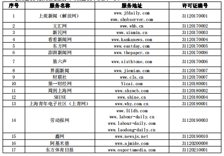 另,上海属地内的上海观察者信息技术有限公司、上海基分文化传播有限公司由国家互联网信息办公室颁发《互联网新闻信息服务许可证》,准许其从事互联网新闻信息转载、传播平台服务。上海热线信息网络有限公司由国家互联网信息办公室颁发《互联网新闻信息服务许可证》,准许其从事互联网新闻信息转载服务。