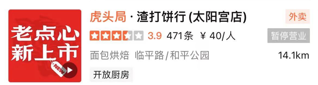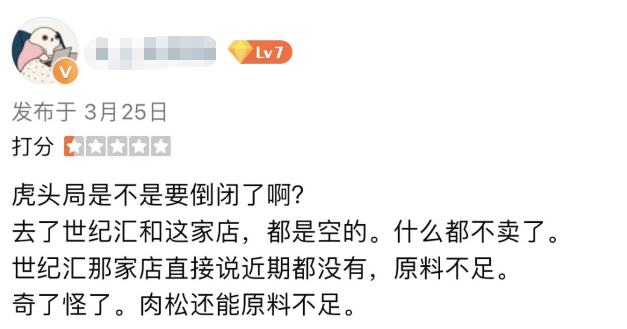 目前虎头局在上海有10家门店,在某点评平台上,中山公园店和太阳宫店,都显示暂停营业。
