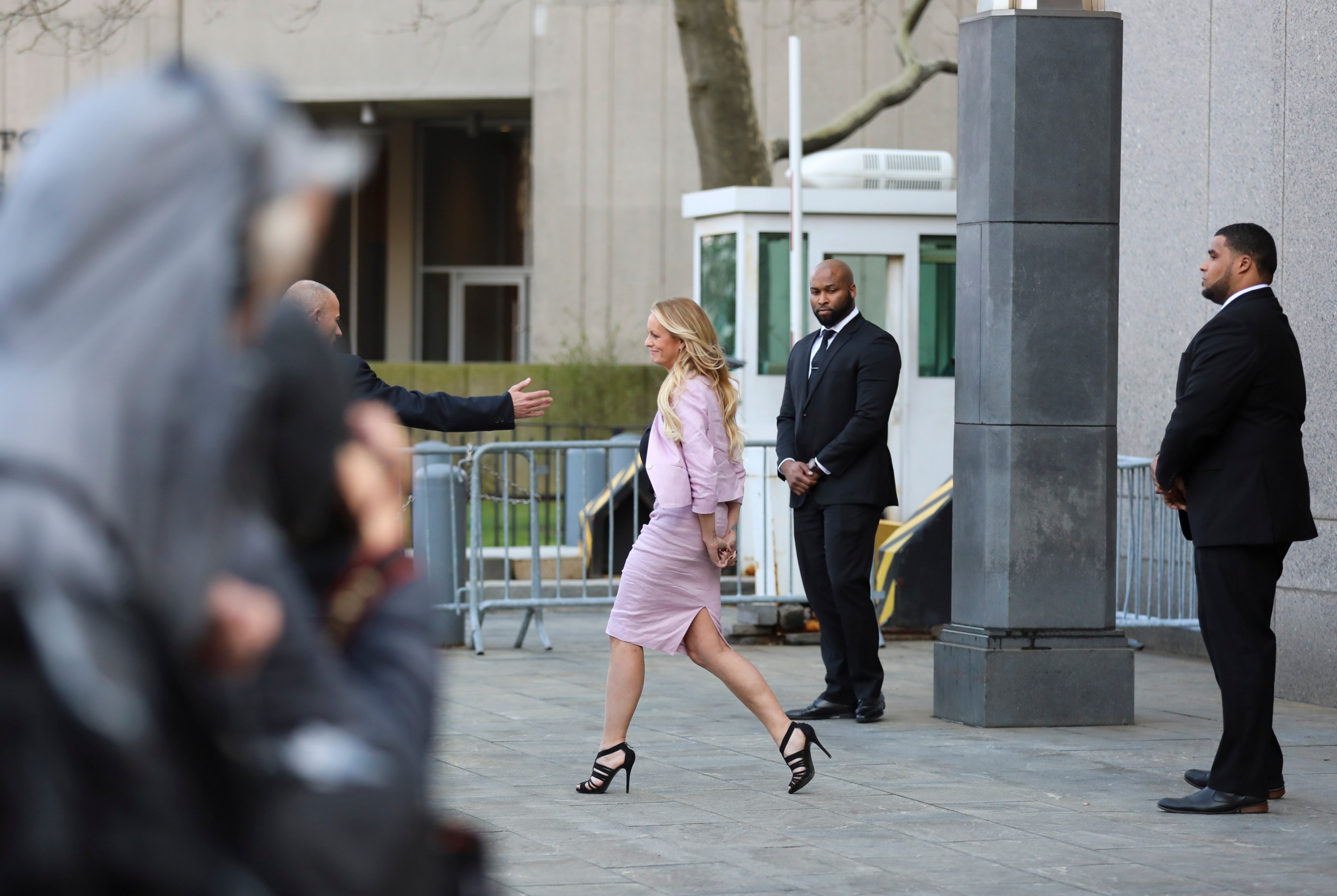 2018年4月16日,在美国纽约曼哈顿联邦地区法院外,艳星丹尼尔斯(右三)出庭后准备离开。新华社记者王迎摄
