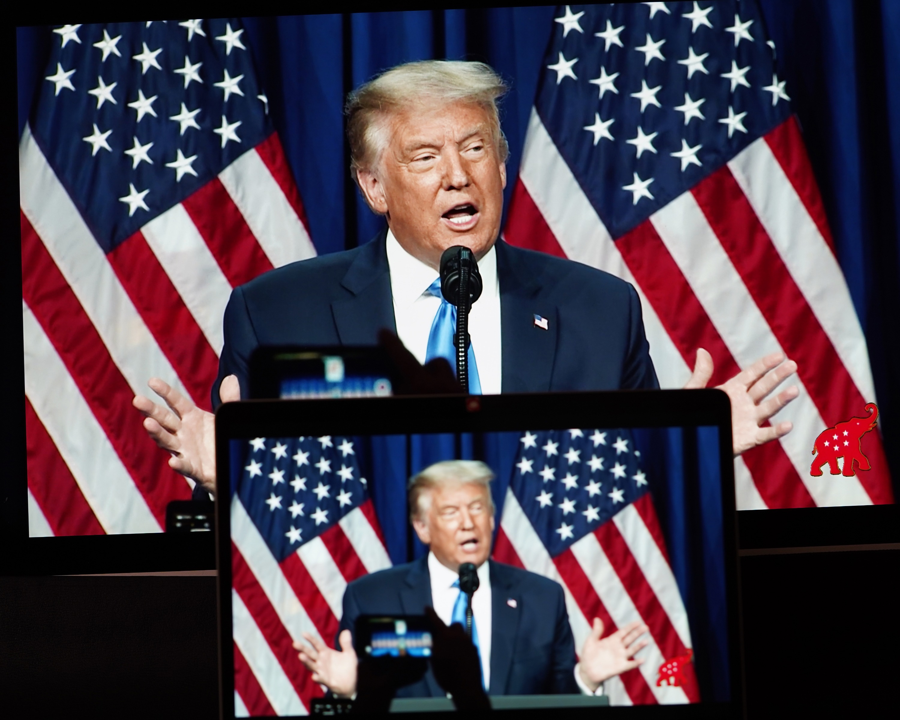 这张2020年8月24日拍摄的视频画面显示,特朗普在北卡罗来纳州夏洛特市举行的美国共和党全国代表大会上讲话。新华社记者刘杰摄