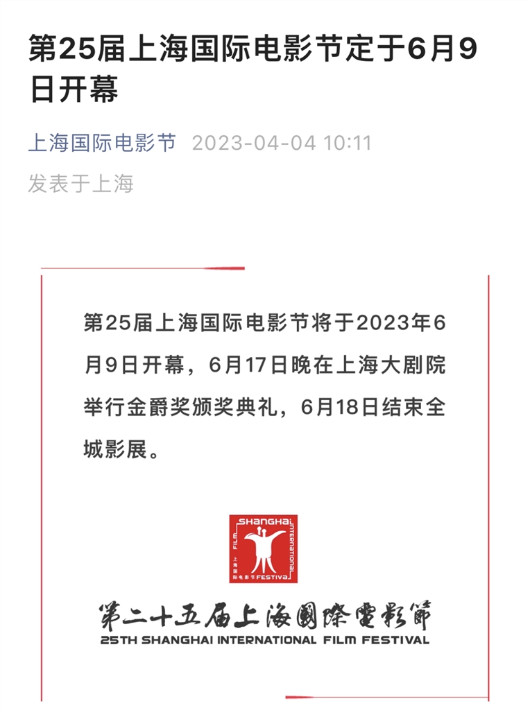 东方网记者董浩帆、熊芳雨4月4日报道:刚刚,上海国际电影节官方微信公众号发布通报:第25届上海国际电影节将于2023年6月9日开幕,6月17日晚在上海大剧院举行金爵奖颁奖典礼,6月18日结束全城影展。
