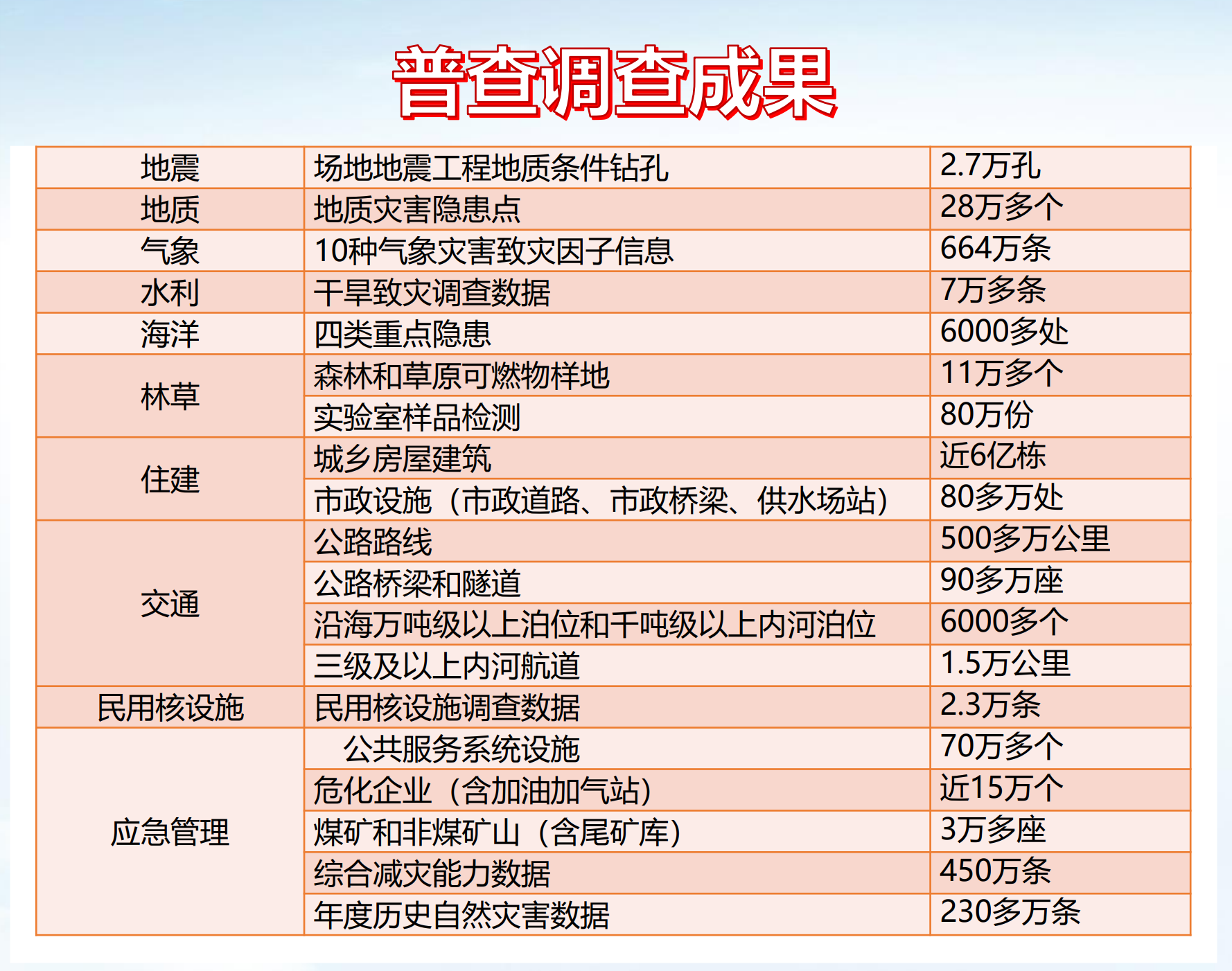 “通过调查,已基本摸清了全国自然灾害风险隐患底数,查明了重点地区抗灾能力”,2023年2月15日,国务院普查办主任、国家减灾委秘书长郑国光在国新办新闻发布会上公开宣布,近三年来,已组织全国近500万专业技术人员参与这次普查调查,共获取全国灾害风险要素数据数十亿条,全面完成了普查调查、数据质检和汇交任务。