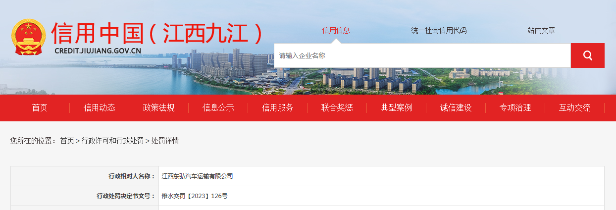 关于对江西东弘汽车运输有限公司行政处罚信息