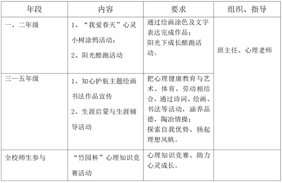 本届心理活动季的主题为:五环行动,润泽心灵。我们以发展性心理健康教育与积极心理学理念为主导,关切学生成长需求及凸显问题,结合本校实际,广泛开展各类心理健康教育活动,宣传普及心理健康知识,引导学生自我探索,提升学生自助互助意识和能力,让更多师生关注心理健康,培养学生自信自强、积极向上的心态。竹园小学各校区都组织开展了心理健康活动季的开幕式,具体安排如下: