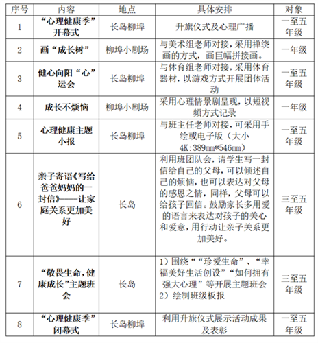 长岛、柳埠校区的心理健康辅导老师张丹和过晓丹根据学生年龄特点设置了不同的心理活动,有和体育老师相结合的“心”运会、有培养亲子关系的一封信等。除此之外,在教师方面,也举行了一次缓解压力的分享交流讲座。