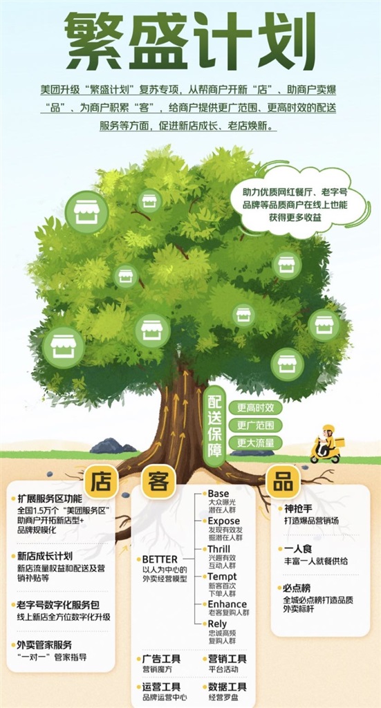 伴随着供给端的多元化,越来越多外卖用户积累了在外卖平台的使用及探索经验,逐渐衍生出更具体、个性化的行为和需要。为了帮更多商户开好店、卖好品、积累客,助力万店餐饮品牌今年数量翻倍,美团今年升级“繁盛计划”复苏专项,从帮商户开新“店”、助商户卖爆“品”、为商户积累“客”,给商户提供更广范围、更高时效的配送服务等方面,促进新店成长、老店焕新,助力老字号品牌、优质网红餐厅等线下广受好评的品质商户,在线上也能获得更多的销量和好评。