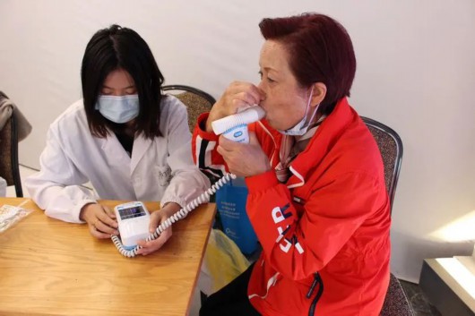 副主任医师汪蜀则介绍了吸烟危害和戒烟方法,护士长贺亚楠向大家演示了哮喘吸入装置的正确使用方法,姜娜娜护士长手把手教大家呼吸六字诀和耳穴养生操。科普讲座结束后,医生们为参加活动的患者和市民提供了免费的肺功能检测、慢阻肺筛查以及治疗指导。