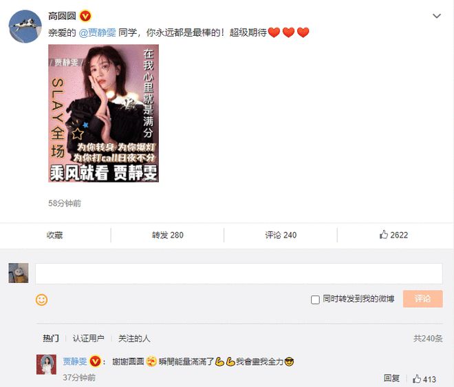 贾静雯也在评论区回应高圆圆:“谢谢圆圆,瞬间能量满满了,我会尽我全力。”