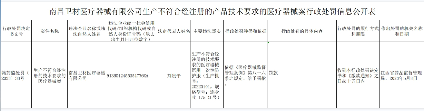 中国质量新闻网讯 5月10日,江西省药监局网站公开医疗器械行政处罚信息(赣药监处罚[2023]33号),涉及南昌卫材医疗器械有限公司。