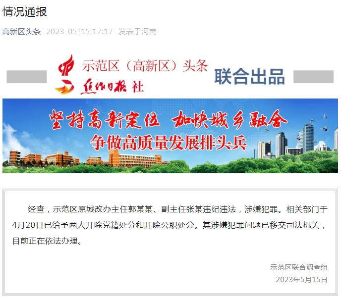 “高新区头条”微信公众号5月15日发布情况通报:经查,示范区原城改办主任郭某某、副主任张某违纪违法,涉嫌犯罪。相关部门于4月20日已给予两人开除党籍处分和开除公职处分。其涉嫌犯罪问题已移交司法机关,目前正在依法办理。