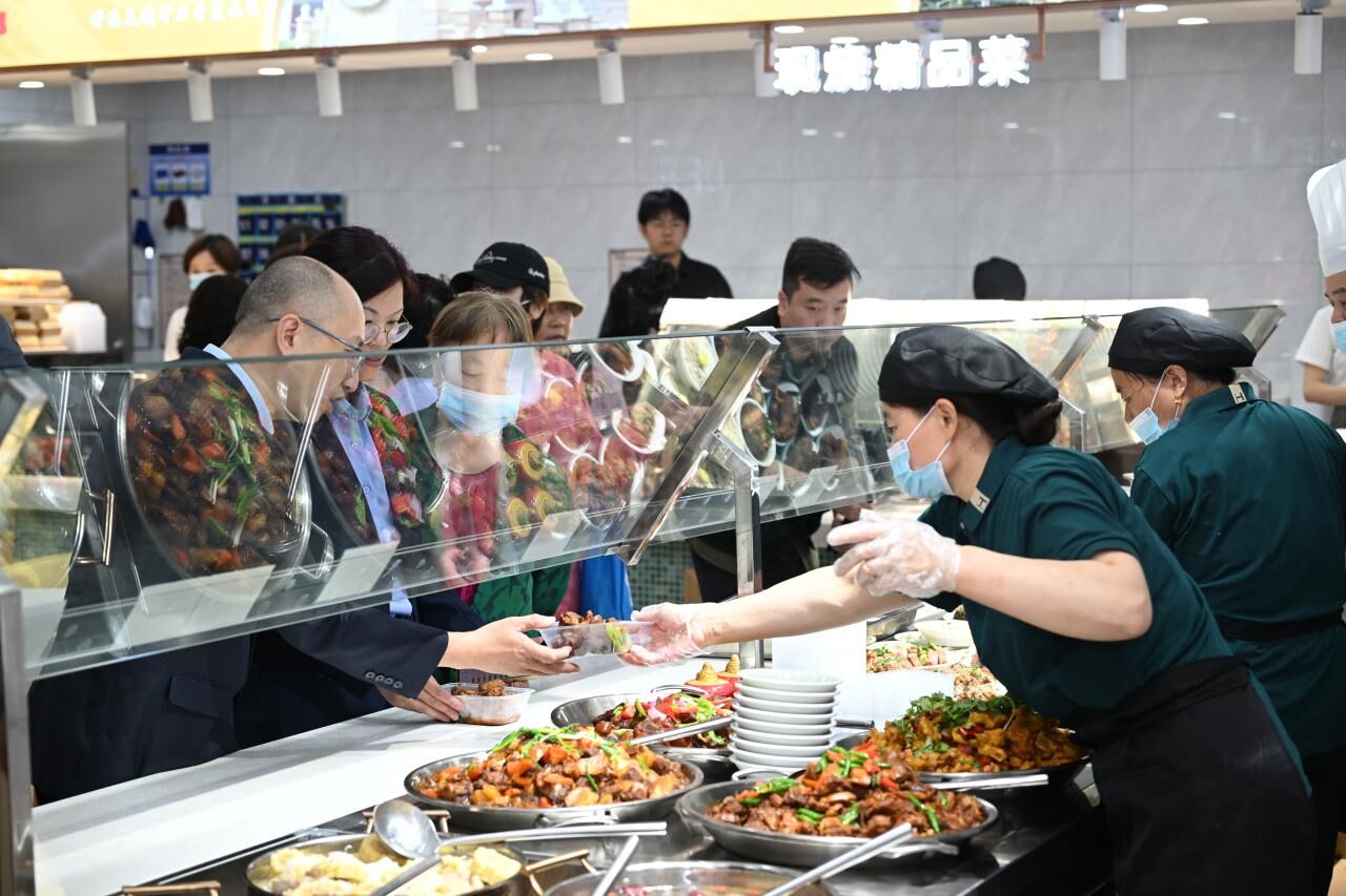 启动当天,现场人头攒动,前来捧场“静邻一家”便民集市的居民络绎不绝,欢欣踊跃参与老字号品牌展销、街道慈善超市物品售卖、便民菜点、未保站、劳动调解咨询等。在在众多服务项目中,同心荟社区食堂热度最高。领导们亲切向社区老人表达问候、赠送糕点,老年们吃在嘴里、甜在心里。“我们都非常期待也非常满意这食堂开出来了”,“干净放心,老适宜来”,“菜色蛮好的,欢喜额”,居民们纷纷叫好,围坐着一边“嘎三胡”一边用餐,上演一出温馨的“老友记”。