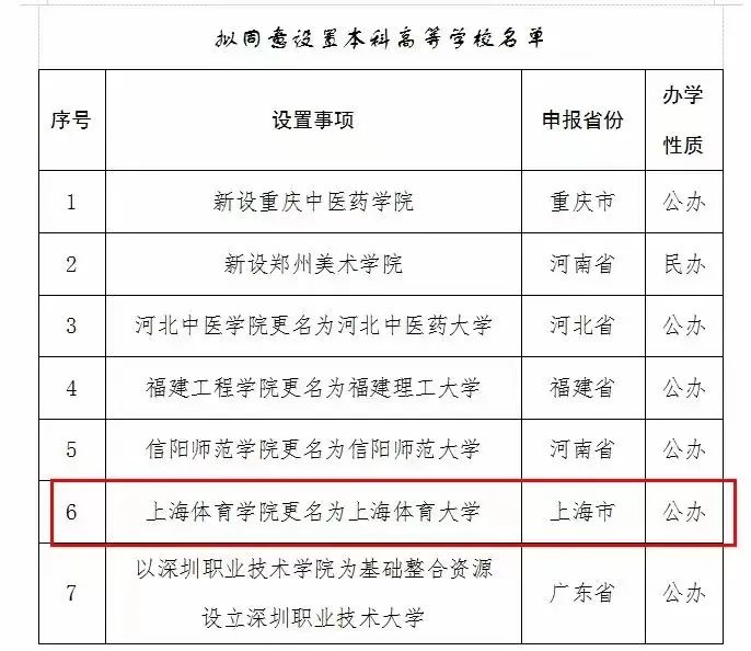 5月22日,教育部网站发布《关于拟同意设置本科高等学校的公示》,同意上海体育学院更名上海体育大学等,公示原文如下: