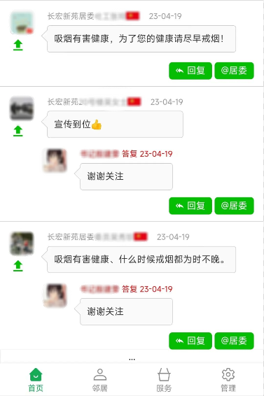 长宏新苑居委在今年的世界无烟日即将到来之际,组织楼组长、志愿者更换新的禁烟标志,同时利用社区通平台,开展控烟宣传活动,引导居民践行文明健康、绿色环保的生活方式。通过宣传活动,不少居民表示要努力戒烟,不让“二手烟”影响家人身体健康。