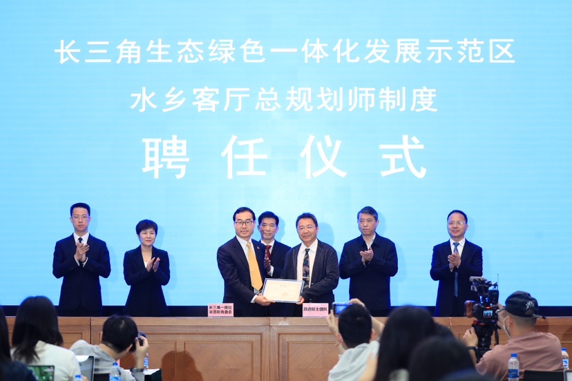 示范区执委会向东南大学段进院士团队颁发了水乡客厅总规划师聘书,这标志着水乡客厅总规划师制度正式建立。为破解区域开发过程中容易出现的规划与实施“两张皮”、规划蓝图实施中“变形走样”等问题,保障水乡客厅开发建设品质,示范区执委会聘任院士团队为水乡客厅开发建设提供全过程、伴随式的技术咨询服务,实现一张蓝图干到底。