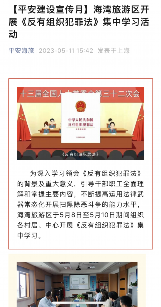 为扎实推进“平安海旅”建设工作走深走实,大力营造平安、和谐、稳定的社会环境,增强群众支持、参与平安建设的主动性与积极性,海湾旅游区于5月10日至6月10日开展2023年“平安建设宣传月”活动。