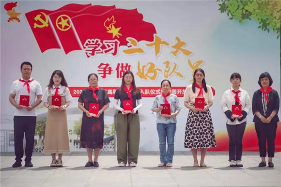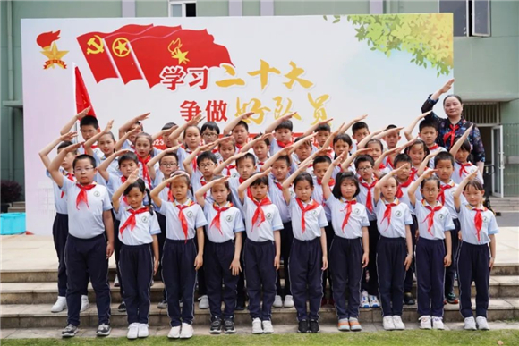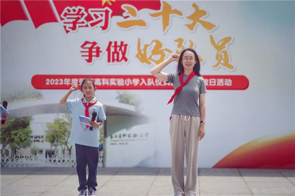 在鲜艳的队旗下,新队员们骄傲地挺起胸膛、握紧右拳,跟着大队辅导员马雯晔老师呼号。