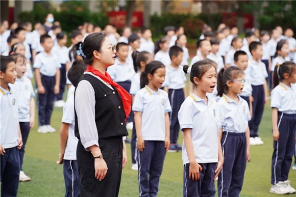 队员们齐唱队歌,铿锵有力的歌声传递着少先队员热爱党、热爱祖国、热爱人民的真挚情感,一张张笑脸洋溢着激动和兴奋。“我们是共产主义的接班人,继承革命先辈的光荣传统……”嘹亮的歌声响彻高科实小。